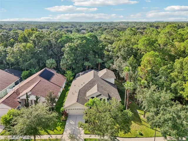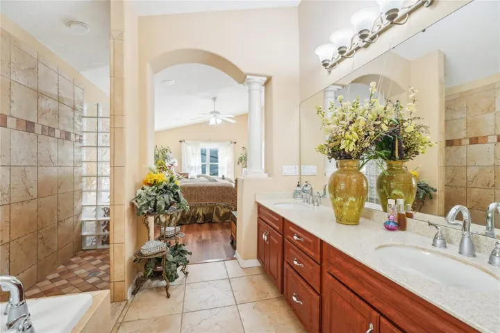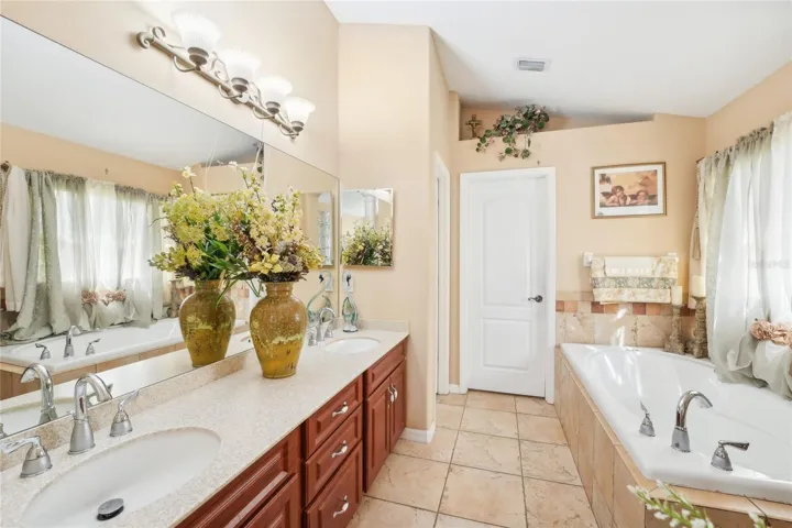 The kitchen also includes a large island, a large breakfast bar, a walk-in pantry, a wine rack, crown molding above kitchen cabinets, newer disposal (2021). The family room offers great views of the conservation, along with a gas-burning fireplace, surround sound system, and built-in entertainment center, with triple-glass sliding doors leading to the pool and spa area. The primary suite is a true retreat with serene conservation views, and it connects to the pool area, which is on the first floor; offering newer luxury vinyl flooring, surround sound speakers, a vaulted ceiling, an open en suite bathroom with a Jacuzzi brand soaking tub, a separate walk-in shower with grab bars, custom tiles and glass blocks, a dual vanity, a large walk-in closet, plus a remodeled bathroom. Bedrooms 2 and 3 feature newer luxury vinyl flooring, along with great views of the conservation area. Bathroom #2 was tastefully renovated and has a door that leads to the pool area (pool bath). Large 4th bedroom/bonus room (upstairs) features oak handrails and spindles, a closet, a vaulted ceiling, separate surround sound speakers for home theater, and a great view of the conservation. The pool and spa were remarcited in 2022, and have a newer variable speed pump, an oversized pool enclosure was rescreened, plus a removable child safety fence. This is truly a private outdoor retreat surrounded by nothing but nature!