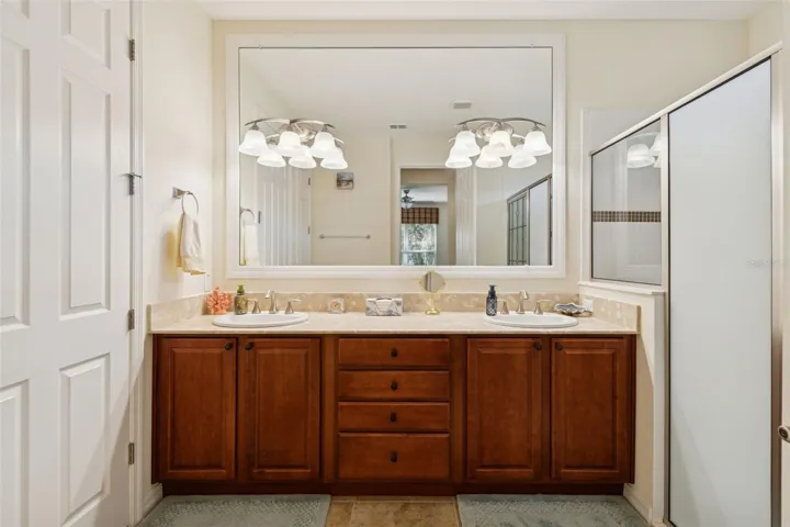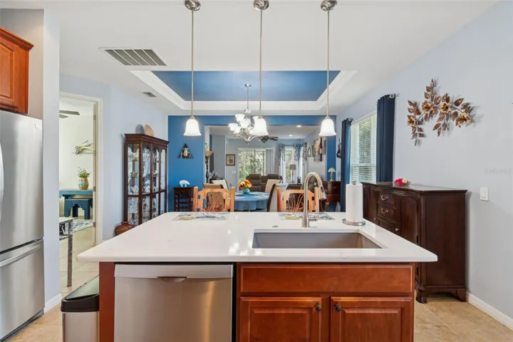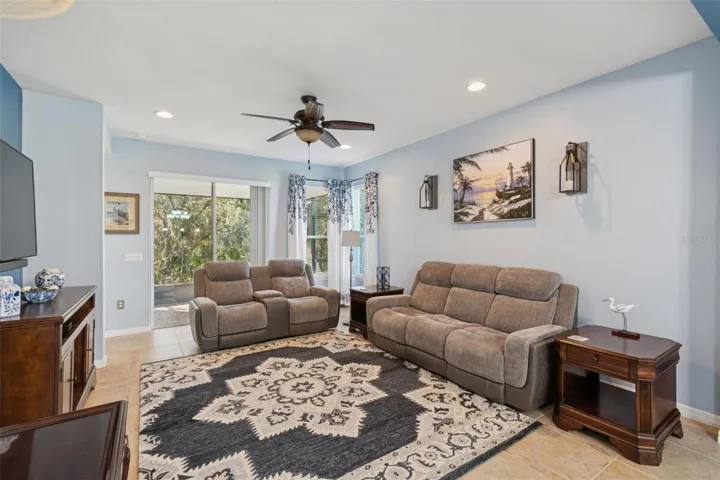 This beautifully upgraded 2 bedroom, den/study, 2 bathroom Like New Brescia model, nestled in the tranquil Mira Vista section of Solivita, offers a serene and luxurious lifestyle surrounded by lush deep conservation areas. The property is designed for those who value both privacy and community, providing a peaceful retreat while also being part of an active neighborhood. As you approach the home, you are greeted by meticulously maintained landscaping that enhance the overall curb appeal. Entering through the charming screened porch, complete with a stunning leaded glass door, you immediately sense the attention to detail and quality that defines this residence. The spacious interior boasts an inviting open-concept layout that seamlessly connects the kitchen and living area, perfect for both entertaining and everyday living. Tile flooring flows gracefully throughout the main living spaces, adding a touch of elegance. The newly upgraded kitchen is truly a chef’s dream, featuring an eat-at bar that encourages casual dining and conversation. It is equipped with top-of-the-line stainless steel appliances (new dishwasher and microwave) that cater to all your culinary needs. A generous walk-in pantry offers ample storage for all your cooking essentials, ensuring that everything is organized and easily accessible. The primary bedroom serves as a personal sanctuary, offering breathtaking views of the conservation area that can be enjoyed every day. This spacious retreat includes 2 walk-in closets and an en-suite bathroom that exudes luxury, featuring double sinks with custom cabinetry, an expansive walk-in shower with built-in seat that provide a spa-like experience at home. Privacy is a key feature of this home, with the guest bedroom and newly remodeled guest bathroom with a walk-in shower, thoughtfully separated from the primary suite. This design ensures that guests have their own space, making it perfect for hosting family and friends. Step outside to the covered and screened Lanai, where you can soak in the stunning sunsets and the tranquil sounds of nature. This outdoor space is ideal for relaxing with a book, hosting gatherings, or simply enjoying the peaceful surroundings that the conservation area provides. Whether you’re sipping your morning coffee or unwinding in the evening, this Lanai is a perfect retreat. For added convenience, the home includes a 2-car garage. Solivita offers residents access to state-of-the-art amenities and work out facilities, dance and aerobics studios, a business center, 14 heated swimming pools, 2 heated spas, tennis courts, pickleball courts, shuffleboard, bocce ball, billiards room, art gallery, 3 restaurants and 2 championship 18-hole golf courses, driving range and putting course. Every day offers something new to explore and enjoy! This home also features easy access to nearby shops, as well as a brand-new shopping center that caters to all your needs, dining, and health care, offering the perfect balance of privacy and lifestyle.