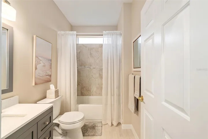 The guest bedroom, located at the front of the home, offers carpeted flooring, wood valances, and a ceiling fan. The fully remodeled guest bath features tile flooring. A versatile study/den with engineered wood flooring is positioned between the bedrooms and provides ample space for an office, seating area, and even a hide-a-bed. The living and dining areas feature engineered wood flooring, mini blinds, and white wood valances. The enclosed lanai is under heat and air with acrylic windows and sunshades, overlooking a private fenced area just inside the boundary lines. An adjacent outdoor patio provides the perfect spot for grilling and enjoying the Florida sunshine.