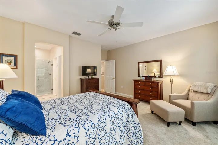 One of Del Webb’s most popular models is now available and truly a must-see. Situated on a very private lot with room for a pool, this beautifully upgraded home offers exceptional indoor and outdoor living. From the moment you review the description, photos, and video, you’ll want to schedule a personal tour. The upgraded kitchen features tall white refaced cabinets with custom hardware, granite countertops, stainless steel appliances, recessed lighting, and ceramic tile flooring. The spacious primary suite includes bay windows, a ceiling fan, carpeted flooring, and a completely renovated ensuite with a large walk-in shower, skylight, and tile flooring.