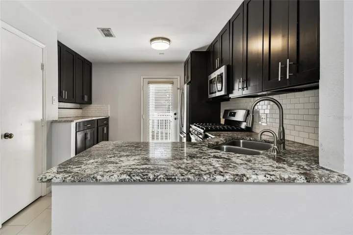 One or more photo(s) has been virtually staged. Welcome to Lake Ellen Walk in the heart of Carrollwood. This updated three bedroom, two and one half bath townhome offers easy, low maintenance living with tile floors throughout, a modern kitchen with granite counters, stainless appliances, and a gas stove, plus convenient in-unit laundry. The first floor primary suite opens directly onto a deck overlooking the pond and fountain, creating a calm place to start or end your day. Upstairs, two spacious bedrooms with vaulted ceilings share a full bath with double vanities.