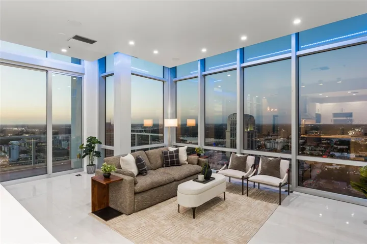 Welcome to Penthouse Living where you can indulge in unparalleled luxury with this elegant two-story, corner penthouse, commandingly positioned atop the heart of Downtown Orlando. Boasting just under 2500sf with 3 bedrooms, 3 full bathrooms, and 1 half bath, this tastefully upgraded residence offers the ultimate in modern comfort and style, with sweeping western-facing views that provide stunning city and sunset views every evening. As you enter the home, you’re greeted by opulent finishes and a warm contemporary design while the expansive floor-to-ceiling windows flood the home with natural light. You’ll find a thoughtfully and efficiently designed kitchen with Subzero appliances, complemented by a butler’s serving area with wine refrigerator in the dining room that is ideal for curating your collection and hosting dinner parties in style. The spacious primary suite is a calming and comfortable sanctuary, complete with custom accent built-in shelving and drybar. Walking through the oversized custom closet with backlit onyx, you’ll find yourself in the jaw-dropping spa-like bathroom adorned in marble. This luxurious space was designed with both glamour and function in mind to include heated floors, backlit mirrors and personalized touchscreen shower system. The two additional bedrooms complete the main floor each with its own beautifully appointed bathroom and floor to ceiling windows for the same captivating views. A true highlight of this penthouse is the private rooftop terrace – as you ascend up the spiral staircase to the landing area you’ll find another wet bar for convenience and powder bathroom. Whether you’re enjoying the sunset, entertaining guests, or simply relaxing in your personal outdoor retreat, this rooftop space adds a unique and rare element to this already stunning residence. Additional enhancements include a Creston system for complete home automation and remote control window shades. Control lighting, temperature, and entertainment at the touch of a button. LED accent lighting throughout the home adds a modern touch, enhancing the home’s ambiance and highlighting its sleek design. The Vue is a highly coveted Downtown Orlando address offering access to top-tier building amenities such as valet parking, state-of-the-art fitness center, pool and deck overlooking Lake Eola, basketball/tennis court and concierge service. This lavish home in the sky is steps away from fine dining, shopping, entertainment, and cultural attractions, offering the perfect balance of urban convenience and luxury living.