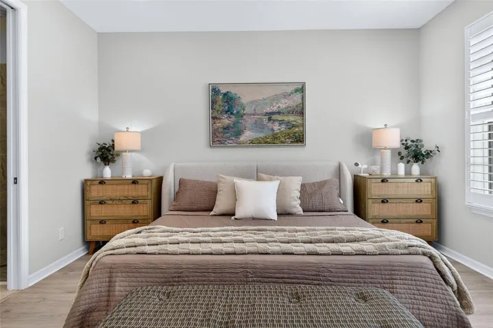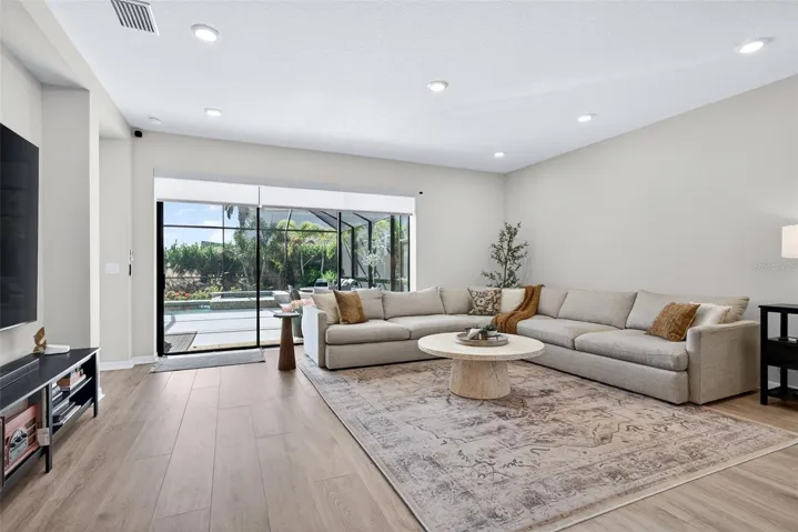 From the moment you arrive, the extended paver driveway, upgraded front entry, and enhanced landscaping with mature trees make a striking first impression. Inside, the home unfolds into a bright, open-concept layout where natural light pours through expansive south-facing sliders, framing the spectacular outdoor living space beyond. Plantation shutters throughout add timeless elegance and privacy, while high-end finishes elevate every room.