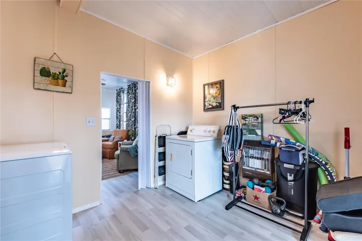 The home features a finished Florida room with an indoor laundry area, offering easy access to the fully fenced backyard and workshop with all the tools included, perfect for hobbies or extra storage. Inside, you’ll find a spacious living room open to the dining area, creating a welcoming space for everyday living and entertaining. A front bedroom with a half bath provides added convenience, while two additional bedrooms in the rear share an updated hall bathroom.