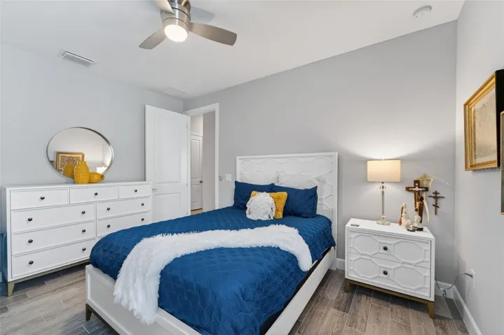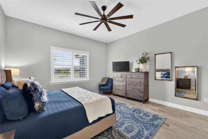 Primary Suite: A secluded retreat featuring a custom-built walk-in closet and a luxury en-suite complete with tall upgraded cabinetry and elegant granite countertops.