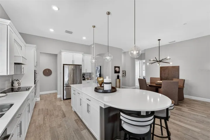 Gourmet Kitchen: A chef’s dream featuring sleek quartz countertops, 42″ soft-close cabinetry, a custom backsplash, and premium built-in appliances.