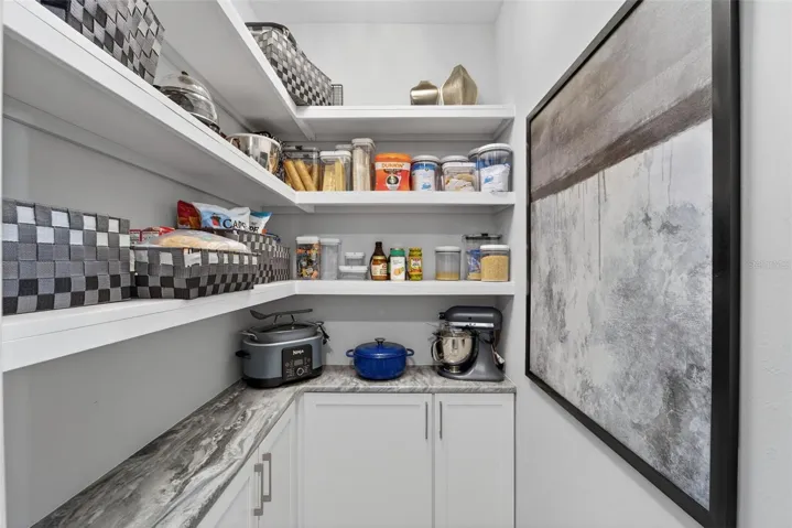 Custom Storage: Custom-built cabinetry in the pantry and primary walk-in closet.