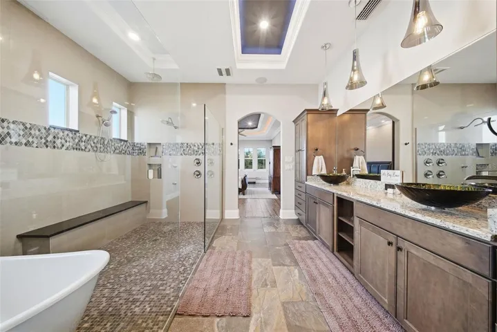 One or more photo(s) has been virtually staged. Experience elegance in this meticulously crafted residence, positioned in the exclusive gated Graybrook section of the Watergrass community. From the moment you arrive, the home commands attention with its grand stone circular entrance—setting an impressive tone for the refined luxury found inside. Step through the custom made front door to soaring ceilings, dramatic illuminated tray accents, and a seamless blend of architectural sophistication and comfort. The main level highlights four spacious bedrooms and four beautifully finished full baths. The primary suite is a sanctuary of serenity, featuring custom-designed closets and a spa-inspired bathroom complete with a freestanding soaking tub, rain shower and multiple massage sprays for a truly indulgent experience. At the heart of the home, the gourmet kitchen is a culinary showpiece, equipped with premium Viking appliances, a large entertainer’s island, and exquisite craftsmanship throughout. Its open flow into the family room creates an inviting environment ideal for elegant hosting, relaxed living, and unforgettable gatherings. Just off the formal dining room, a private courtyard provides a peaceful setting for alfresco meals or morning coffee. Designed for resort-style living, the outdoor space is nothing short of exceptional. The heated, saltwater pool/spa are enclosed within an expansive screened lanai, offering year-round enjoyment and seamless indoor–outdoor living. This luxurious setting is further elevated by a fully equipped outdoor kitchen for effortless entertaining and a cozy fire-pit area that adds warmth and ambiance to evenings by the pool. Beyond the lanai, the home backs onto pristine conservation land and a tranquil pond, ensuring privacy, natural beauty, and breathtaking views that enhance the sense of retreat. A spacious three-car garage provides ample storage and convenience, completing the main level. Upstairs, a versatile media room or fifth bedroom awaits—complete with its own full bath and access to a private balcony. Perfect for movie nights, game nights, or simply unwinding, this elevated space offers flexibility and comfort. As a resident of Watergrass, you’ll enjoy resort-style amenities, including three community pools, a state-of-the-art clubhouse with a gym, a pavilion, and numerous parks—including one right in Graybrook. Convenience is unmatched with I-75 just minutes away and everyday essentials like Publix and Starbucks just down the street. Top-rated schools, including Watergrass Elementary, Kirkland Ranch Academy of Innovation, and Innovation Preparatory Academy, are just moments away. The home’s prime location also offers easy access to Tampa Premium Outlets, Wiregrass Mall, KRATE at the Grove, top hospitals, and an array of dining and retail options. This extraordinary home offers an unparalleled blend of luxury, convenience, and community living. Don’t miss the opportunity to make it yours—schedule your private tour today!