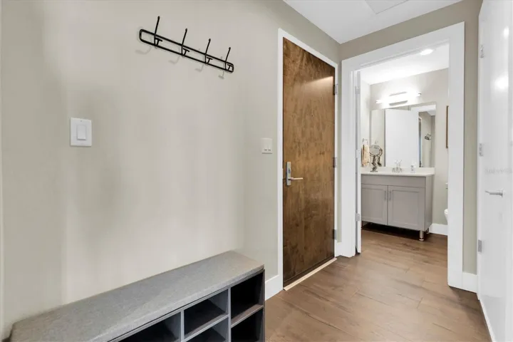 SPECTACULAR WATER VIEWS in this light-filled and spacious 1-BR 12th floor corner unit in the Salvador Building, optimally located to enjoy downtown living in style. Upscale and in pristine condition, the unit features engineered hardwood floors, an open concept layout and well-designed kitchen space with quartz counters, a large center island, ample cupboards, and stainless steel Bosch appliances including a gas cooktop and a wine fridge. Huge windows and balcony flood the living area with light and provide expansive sunrise and sunset views. Large bedroom includes a generous walk-in closet, attached bathroom with tub/shower, and another large window facing south with water views. There is a half bath off the entrance hall, and in-unit laundry room. Also includes a secure assigned parking spot with electric vehicle charger, and climate-controlled storage. The Salvador is a LEED certified, professionally planned, and artfully designed building, solidly constructed to withstand a category 4 hurricane. Numerous amenities including a concierge staffed lobby, saltwater pool and lounge area, state-of-the-art fitness center, well-appointed community room with opportunities to socialize, dog walk area with washing station. Dali Boulevard is a tree-lined street, a peaceful oasis a few blocks from The Pier, The Dali Museum, galleries, numerous waterfront parks, and dozens of restaurants and shops as well as a Publix, CVS, Starbucks, hospitals, and the USFSP campus. WalkScore is 97, BikeScore 91. Comfort, style and convenience in Downtown St. Pete, in your slice of paradise.