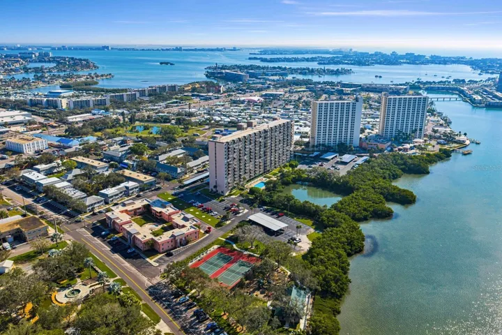 AMAZING WATERFRONT VIEWS! Experience true Florida coastal living at Chateau Tower in this 8th-floor corner-unit condo offering 2 bedrooms and 2 bathrooms with sweeping, unobstructed views of Boca Ciega Bay and stunning Gulf of Mexico sunsets. Enjoy morning coffee or evening cocktails from your private waterfront balcony, where vibrant skies and tranquil bay views create the perfect backdrop. Dedicated, covered parking space just steps from the main entrance. Inside, the open-concept floor plan is ideal for entertaining and ready for your personal design vision. Major updates include a NEW A/C system and water heater (2024), providing peace of mind. The laundry closet is conveniently located near the kitchen for everyday ease (not all units have their own washer/dryer inside the unit but this one does!). Chateau Tower also has a public laundry room on the first floor of the building. The primary en-suite retreat is tucked privately at the rear of the residence, featuring serene waterfront views and a spacious walk-in closet. A separate guest bedroom and full bathroom at the front of the unit provide added privacy for visitors or a home office setup. Chateau Tower delivers resort-style amenities, including a waterfront heated pool, hot tub, fitness center, sauna, and steam room. Residents also enjoy outdoor grilling areas, bike storage (if available, for a small fee), kayak storage with direct bay access, a party room with kitchen, library, and an expansive recreation room featuring billiards, ping pong, and shuffleboard. Launch your kayak directly into the bay and paddle alongside dolphins and manatees. Ideally located just steps from Bay View Park and public tennis courts, and only 5 minutes from the beautiful sands of award-winning St. Pete Beach. Convenient access to Publix, Walmart, popular restaurants and just 20 minutes to vibrant Downtown St. Petersburg. This is a rare opportunity to own a waterfront condo in South Pasadena with unbeatable views, amenities, and location—coastal living at its finest.