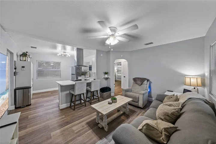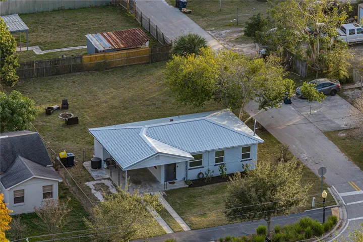 Located on a corner lot within close proximity to the heart of downtown Auburndale, this inviting and well-maintained home offers a comfortable layout with thoughtful updates throughout. During the most recent renovation, the home was updated with a beautifully designed eat-in kitchen featuring updated cabinetry, quartz countertops, tile backsplash, stainless steel appliances, range hood, and stylish fixtures. The bathroom was updated with a modern vanity and tile, and the home offers LVP flooring throughout with tall baseboards. The primary bedroom features built-in closet storage providing ample organization, while the secondary bedroom includes custom built-ins that can be easily tailored to suit a variety of uses. Notable features include a metal roof installed in 2022, a tankless water heater installed in 2017, and an HVAC system replaced in 2020. A 6×12 utility room with washer and dryer hookup connects to the carport and provides ample storage, and the fully fenced backyard features a firepit that creates an inviting atmosphere for gathering and entertaining, along with a double gate offering side access for added flexibility. Conveniently located near local shops, dining, and community amenities, this home is also just a short drive from many area lakes, including Lake Ariana and the famous Chain of Lakes in Winter Haven, offering endless opportunities to enjoy the Florida lifestyle, and presents a great opportunity for a variety of buyers.