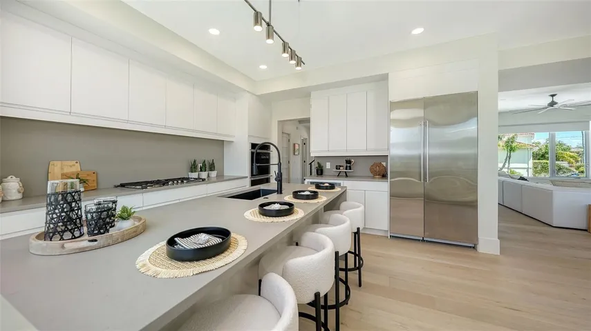 Feel the sea breeze in the spacious backyard, including a pool, hot tub, and outdoor kitchen. Enjoy light-toned engineered hardwood floors, a chef’s kitchen with top-tier appliances, and spacious en-suite bedrooms, including a stunning primary suite with a private terrace and spa-like bath. Additional features include a 3-car garage, and 6 covered carport spaces for recreational utility vehicles such as, jet skis, golf carts, or a boat, with easy gate access. Enjoy an elevator included layout, and high-end finishes throughout—all just minutes from Siesta Village’s shops and dining.