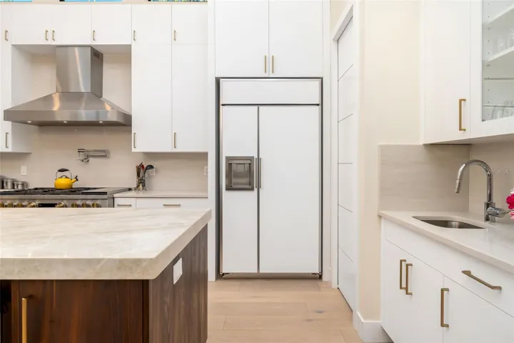 The chef’s kitchen is exceptionally appointed with matte finished custom cabinetry, professional-grade appliances, including a 48-inch GE Monogram dual-fuel range with six burners and griddle, Bosch dishwasher, wine refrigeration, and a large center island topped with quartzite, ideal for cooking, entertaining, and gathering.