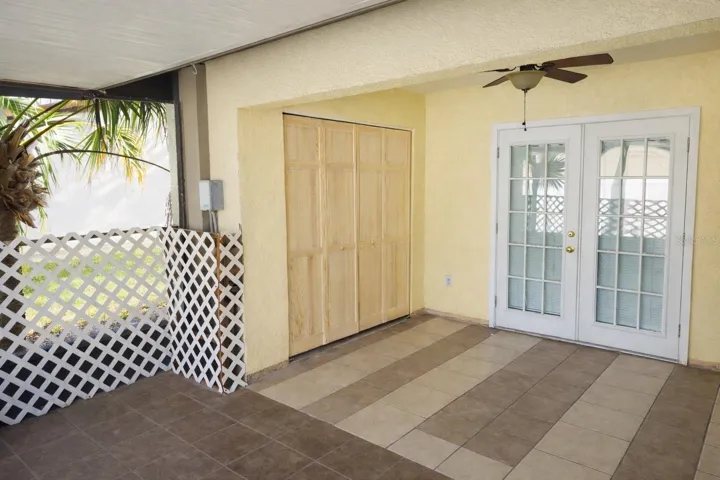Recent updates add peace of mind and comfort, including a new water heater and ceiling fans throughout the home, with dual remote-controlled fans in the living area for added convenience. The split-bedroom layout enhances privacy, and both bedrooms feature walk-in closets. The primary suite is comfortably sized with a private en-suite bathroom, while French doors open to the enclosed Florida room at the rear of the home. The second bedroom is equally versatile and works well for guests, a home office, or additional living space.