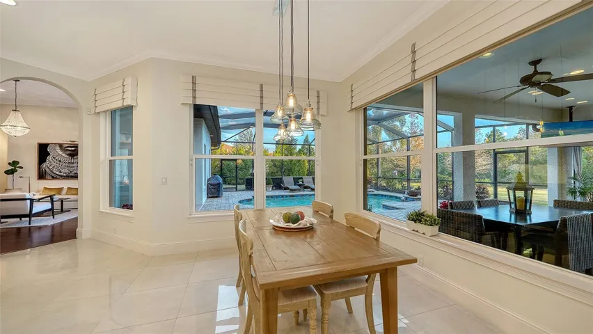 Rich wood and tile flooring, crown molding, and timeless architectural details create a warm, sophisticated atmosphere throughout. The formal living room flows seamlessly to the pool terrace, setting the stage for memorable gatherings. At the heart of the home, the gourmet kitchen impresses with quartz countertops, a statement center island, designer tile backsplash, and top-tier appliances—perfect for hosting everything from intimate dinners to festive celebrations.