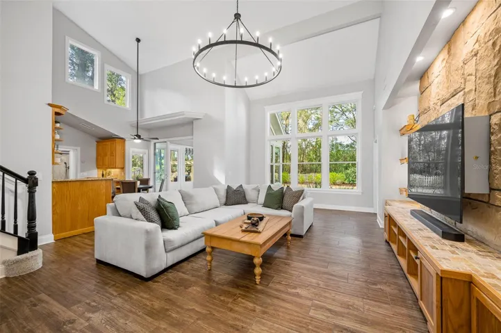 You’ll love coming home to this completely renovated two-story luxury home situated on a premium lot in Haile Plantation. Exceptional curb appeal and a brick paver pathway leads to this stately home with a gorgeous leaded-glass front door. Inside, the elegant formal dining room sits to the left, featuring classic wainscoting and a stunning chandelier—perfect for entertaining. Beyond the dining room, the expansive family room impresses with cathedral ceilings, a dramatic lighted stone entertainment wall, and a gorgeous oversized chandelier that anchors the space. The chef’s kitchen is truly the heart of the home, thoughtfully designed with stainless steel appliances including a Wolf six-burner gas cooktop, a wall oven and microwave, granite countertops, custom wood cabinetry, a wine refrigerator, and a wood vent hood. A large island with a prep sink provides additional workspace. The kitchen overlooks the breakfast nook and the sun-filled Florida room, which features a wood-burning fireplace and a coffered ceiling, all overlooking the newly landscaped, expansive backyard. Located between the dining room and kitchen is an incredible butler’s pantry with a built-in oven, granite countertop, glass door cabinetry and a large walk-in pantry with custom shelving. Just off the kitchen is a well appointed full bath ideal for pool or outdoor access.The large laundry/mud room is complete with a second refrigerator, a sink, lots of cabinets and a window. The primary suite is conveniently located on the main level and offers a large walk-in closet and a beautifully renovated, spa-like en suite bath with dual vanities, a free standing soaking tub, and an exceptional walk-in shower with floor to ceiling tile and multiple shower heads. Also on the main floor is a spacious guest bedroom with a Murphy bed, a fully renovated hall bathroom with a walk-in shower. Upstairs, you’ll find a generous flex space, two additional bedrooms, and a full bathroom with double sinks and a tub/shower combination. A large storage/bonus room adds versatility, and one of the upstairs bedrooms is plumbed for an additional bathroom. Step outside to a private, low-maintenance, fenced backyard featuring a hot tub, a charming gazebo with swings, and a fire pit—perfect for relaxing or entertaining. The Haile Plantation community offers miles of walking trails, parks, playgrounds, basketball, a Village Center with shops and restaurants and the Hawkstone Country Club. The Hawkstone Country Club (membership required) offers dining, golf, tennis, pickleball, a gym and two pools.
