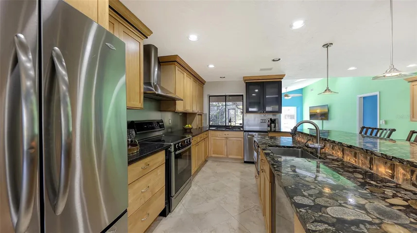 Interior: The bright, open floor plan features vaulted ceilings, skylights, and tile flooring throughout the main living areas. The kitchen is the heart of the home, showcasing granite river-rock countertops, a large center island, stainless steel appliances, and a dedicated coffee and wine station, all open to the living and family rooms. The split-bedroom layout provides privacy, with the primary suite offering direct pool access and tranquil water views. A fourth bedroom near the entry works well as a home office or guest room.