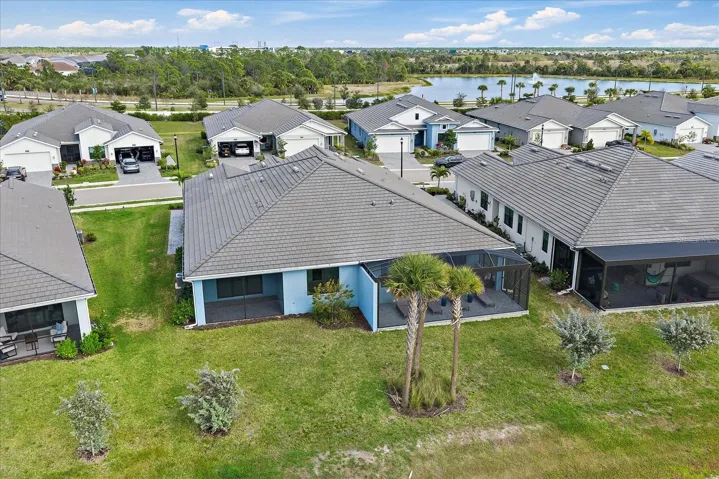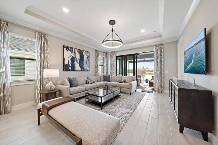 **DESIGNER FURNITURE (partial or all) and GOLF CART AVAILABLE FOR PURCHASE SEPARATELY OR INCLUDE INTO PROPOSAL.** Customized Toll Brothers Rosehall paired villa is loaded with top-of-the-line builder options PLUS additional custom upgrades after purchase including trim work, designer finishes and a huge expanded lanai with lake and fountain views. This beautifully maintained home features 2 bedrooms, 2 bathrooms, and a versatile flex room with a hidden bonus closet—currently styled as an office/TV room/guest space and easily used as a third bedroom. This home features tile flooring throughout, and the 2-car garage features an epoxy-coated garage floor. Notice the upgrades to this home and attention to detail: from the designer lighting & ceiling fans, custom doors, and elegant custom molding and trim work throughout, including eye-catching accent walls in the hallway and flex room. The executive gas kitchen, complete with built-in KitchenAid appliances, quartz counter tops, large island & custom pantry door. The guest bathroom is equally impressive, showcasing a UPGRADED gorgeous walk-in shower with upgraded tile and a luxury rain shower head in addition to the handheld. Open the back glass sliders to your huge expanded lanai that wraps around the back of the villa, featuring a picture-frame screen that creates unobstructed, postcard-worthy views of the serene lake and fountain—a true showstopper and the ideal place to relax morning or night. Schedule your private showing today.