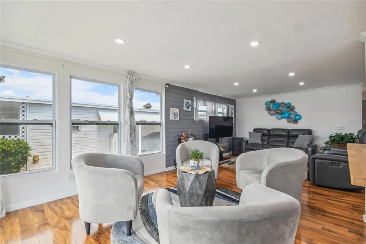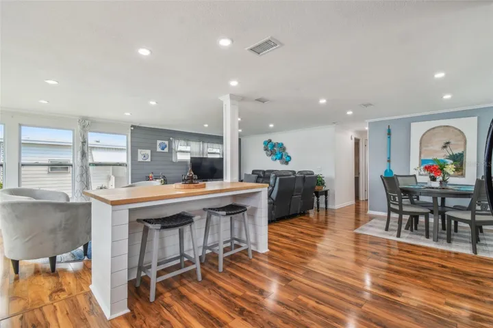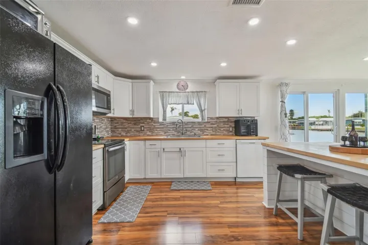 WATERFRONT! Priceless view of the open canal! Absolutely beautiful, rarely available canal front home in mint condition, fully remodeled top to bottom. All this with furniture included all window treatments and ready for you to move in and add your personal decorative touches! Owner has just replaced refrigerator, stove and dishwasher! This WATERFRONT location opens up to all canals coming together. think Venice Italy. You can add a dock with approval and there is also a boat ramp located 3 doors down from the property. Tie up your boat to the cleats on the seawall directly behind the house. Upgrades to include, new kitchen with butcher block countertops, white shaker cabinets, new flooring, crown molding, new bathrooms, all newer windows, new air conditioner 4/2024, new vapor barrier & 16 new piers ($5,100.) installed April 2024 with a transferable 20-year warranty on the piers, upgraded electrical panel 2/2022, new roof over 2/2021. Holiday Shores is an active 55 + community with lots of planned activities and social activities to keep you busy. There is an onsite library for your reading pleasure, a heated pool, pool tables, shuffleboard, putting green and a gym! The gym has 2 treadmills, a weight machine, elliptical and stationary bike! Fishing is abundant from the seawall behind your home! The pool, shuffleboard, clubhouse, gym, office and boat ramp are all stone’s throw from this property, no need to drive! Seller will consider holding a mortgage with a substantial down payment and seller’s approval of credit. PLEASE NOTE: Our park is getting new sewer pipe replacement at no cost to the shareholders but doesn’t look very nice at the present time.