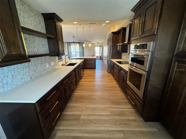 The kitchen is designed for both function and style, featuring soft-close cabinetry, pull-out pantry drawers, spice and cookie sheet cabinets, built-in trash, glass-top stove, pot filler, pop-up electrical outlets in the island and peninsula, a glass rinser at the sink, air-button garbage disposal, and a dedicated coffee bar area. Smart appliances (2023) can be controlled via a phone app.