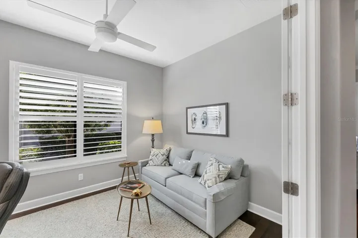 This beautiful home is a must-see! Along the second fairway of the Esplanade Golf and Country Club, this three-bedroom, three- full bath Taylor Morrison extended Lazio model residence offers a spacious layout and an atmosphere of refined comfort. Engineered hardwood floors flow throughout the main living areas, while crown molding and plantation shutters enhance the home’s architectural detail and provide privacy. A soft, neutral palette creates a timeless backdrop for a variety of personal design styles. Meticulous maintenance and pride of ownership are evident throughout. The HVAC system has been recently updated, and the home’s exterior was professionally repainted in 2025. Each bedroom features a full bath and professionally designed closets with built-in storage. The primary suite serves as a serene retreat with a well-appointed bath. Glass French doors enclose the den, offering flexibility as a private office or guest space. The kitchen centers around a large quartz island with a valued breakfast area, and features GE Café Series appliances for a polished culinary experience. A deeded golf membership comes with the property. Expansive fairway rear views and an eastern exposure provide bright and picturesque mornings and shaded afternoons on the spacious lanai. Furnishings are available for purchase under a separate agreement. Residents of Esplanade Golf and Country Club enjoy an array of resort-style amenities, including pickleball and tennis, fitness classes, dance and art classes, health lectures, card and book clubs, as well as numerous social and philanthropic opportunities. Meet up with friends at the Bahama Bar or the popular Culinary Center dining options. Esplanade is within 30 minutes of downtown Sarasota and all its cultural offerings, and less than an hour from famous Gulf Coast beaches. Take this opportunity to enjoy the Florida lifestyle!