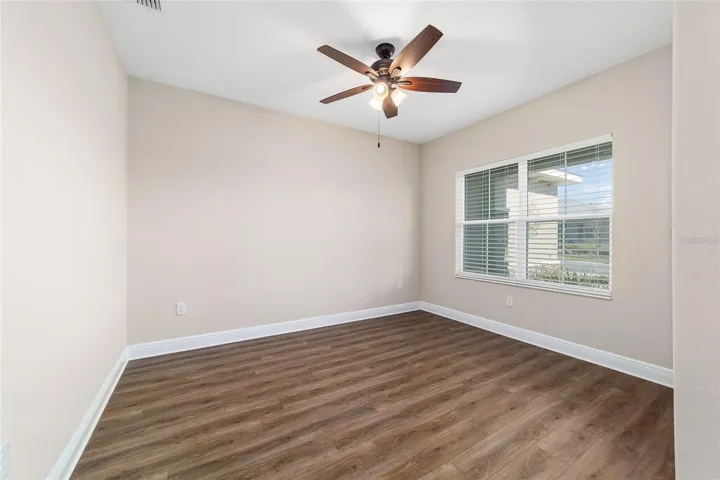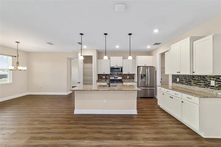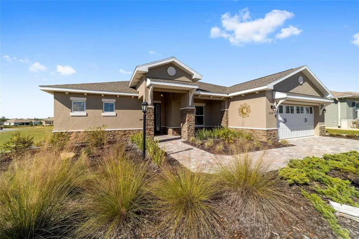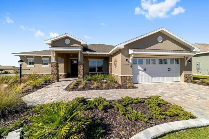 Perfectly positioned on a spacious corner lot, this beautifully upgraded 2-bedroom, 2-bath Livingston model with a flex space offers standout curb appeal with stone accents, a paver driveway, and raised landscaping. Inside, luxury vinyl plank flooring flows throughout an open, light-filled layout highlighted by tray ceilings with crown molding in the great room and primary suite. The kitchen shines with granite countertops, stainless steel Whirlpool gas appliances, tile backsplash, staggered cabinetry, pantry, and a stone-wrapped island accented by pendant lighting; ideal for entertaining. The front flex room, enhanced with a partial wall, provides the perfect space for a home office, dining area, or additional living space. Retreat to the primary suite featuring a walk-in closet and spa-inspired ensuite with dual quartz vanities and a zero-entry tiled shower with built-in bench. Enjoy Florida living on the screened lanai complete with, TV mount, and pull-down shade, plus an extended two-car garage, laundry room with cabinets and sink, and water softener. Additionally, the home has white blinds, Lutron smarthub, Lutron dimmable switches, and amazon smart device. This home delivers style, comfort, and thoughtful upgrades throughout. Located in Ocala’s premier, gated, active 55+ community, loaded with amenities, including golf cart access to 2 shopping centers.