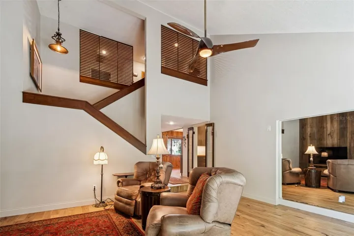 This completely updated residence is truly one of a kind, showcasing quality finishes and thoughtful custom details throughout. Rich wood flooring flows through the main living and bedroom areas, complemented by custom accent walls, built-ins, and three beautifully renovated bathrooms. The inviting family room features a vaulted ceiling, grand fireplace, and a wall of hurricane-rated sliding doors that open to a private, wooded patio—perfect for indoor-outdoor living.