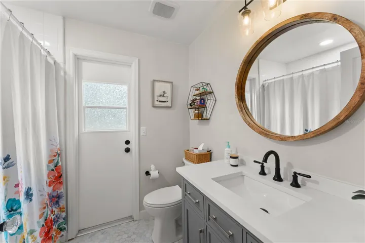 Extensive renovations include a new home addition along with updated flooring, lighting, drywall, millwork, ductwork, HVAC, plumbing, and electrical systems, providing modern comfort and peace of mind throughout. Engineered hardwood flooring adds both elegance and durability. Double doors lead into the private primary bedroom suite, which features vaulted ceilings, large window, and a walk-in closet. The spa-inspired en-suite bathroom includes a dressing room and separate linen closet, granite countertops, a 1930s clawfoot soaking tub, a glass-enclosed shower with dual rain showerheads, and a private water closet. Two newly constructed bonus rooms adjacent to the primary suite provide flexibility that can be used as a home office, nursery, or additional storage. Three additional bedrooms are located on the opposite side of the home and share a beautifully renovated full bathroom, offering comfort and style for family and guests alike. Outdoor living is equally impressive, featuring a newly renovated lanai with a tongue-and-groove ceiling, a covered patio, and an expansive fully fenced backyard. The property also includes two storage sheds and a workshop with its own bathroom, providing excellent potential for a future guest suite, studio, or creative space.