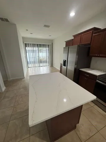 The spacious, chef-inspired kitchen overlooks the great room and boasts crown-molded cabinetry, a large center prep island with seating, stainless steel appliances, a dual-mount sink, and ample counter space for cooking and serving. The adjacent breakfast nook offers a cozy spot for casual meals with views of the backyard and screened lanai.