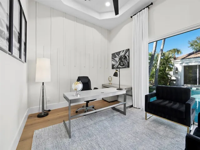 The spacious primary suite offers a serene retreat, while an additional second-level suite with en suite bath and generous bonus room adds flexibility for guests or family. A separate cabana suite also provides ideal privacy for visitors. The dedicated office features new, custom furniture, and the upper mezzanine area is newly furnished, offering a stylish secondary living space.