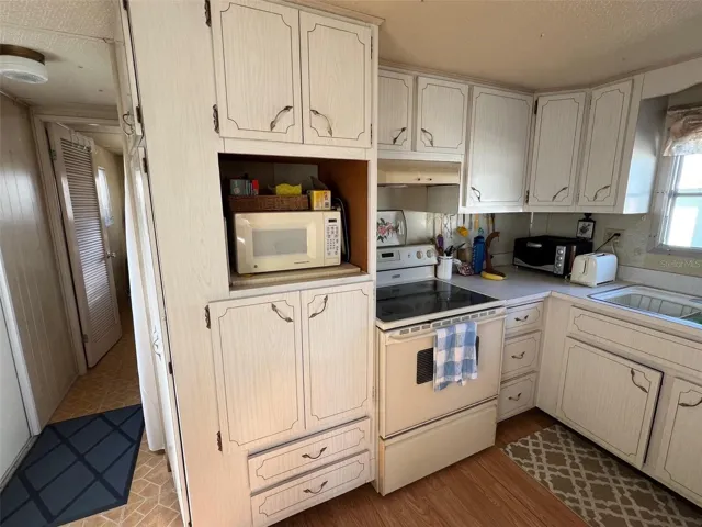 Full of promise, this home presents a kitchen outfitted with all essential appliances, a petite eating area, and impressive storage options—including two built-in cupboards with glass doors that are perfect for displaying cherished items. The inviting living space is ideal for movie nights or entertaining guests, while a heating and air conditioning unit keeps things cozy. There’s also a practical sleeper sofa in the living room-perfect for hosting last-minute guests. The bathroom includes a practical tub-and-shower combo. In the bright, airy bedroom, a mini-split system ensures year-round solace, and abundant storage is provided by two closets and built-in drawers. Featuring laminate floors throughout, attractive wall panels, and a ceiling fan, this home offers a great foundation with plenty of potential for upgrades and personal touches!