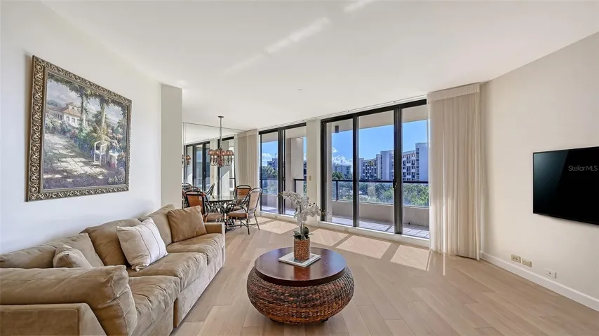 Welcome to this 2-bedroom 2 bath gulf-side residence in the Promenade on Longboat Key, where shimmering water views, swaying palms, and warm coastal breezes shape a lifestyle of relaxed sophistication. A welcoming foyer introduces freshly painted interiors and brand-new luxury vinyl wide-plank flooring, guiding you toward the main living room, where gulf and garden views take center stage. This light-filled space flows beautifully to the outdoors through two sets of sliders that open onto the balcony. The kitchen features wood cabinetry and granite counters, and the adjacent dining room features a granite topped wet bar. The primary suite is a serene retreat with lovely Gulf and garden views, a spacious dressing area, two walk-in closets, and an ensuite bath featuring a marble steam shower and spa tub. A desirable split plan provides privacy for the guest bedroom and marble guest bath. Additional conveniences include a full-size laundry closet with storage shelving, 1 assigned parking space in the secure under-building parking garage, and additional assigned storage space. Life at the Promenade is defined by exceptional amenities and a setting designed for daily enjoyment on the Gulf. The property spans more than 6 acres of landscaped grounds with a boardwalk that winds through tropical foliage to the white sand beach, where inviting tiki huts offer a peaceful, shaded place to relax by the gulf. Residents enjoy an oversized heated pool, whirlpool spa, new covered outdoor kitchen/grilling area, gulf side sundeck, inviting lobby spaces, concierge services, on-site management, a beachside gazebo, secure guard gated entry with twenty-four-hour security, an athletic center, 4 Har-Tru tennis courts, and beautifully appointed gathering spaces including the Sunset Room and Sunrise Room. Longboat Key living offers a rare blend of natural beauty, coastal elegance, and everyday convenience. Residents enjoy pristine beaches, gulf breezes, and a serene island atmosphere, all while being just moments from the vibrant cultural scene of Downtown Sarasota, the shopping and dining of St. Armands Circle, and easy access to SRQ Airport.