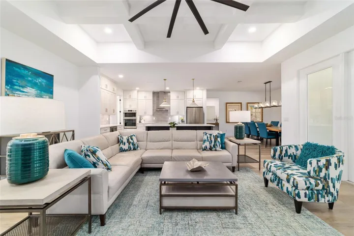 This open-concept home is designed for entertaining with coffered and tray ceilings, designer lighting, ceiling fans, and abundant natural light. The living room opens seamlessly into a beautiful kitchen with quartz countertops, oversized island, induction cooktop, wine refrigerator, custom cabinetry, and a walk-in pantry with coffee and appliance station. A large dining area sits just off the kitchen, perfect for hosting holidays and gatherings. A flex room off the entry can be used as a home office / den, or additional living space.