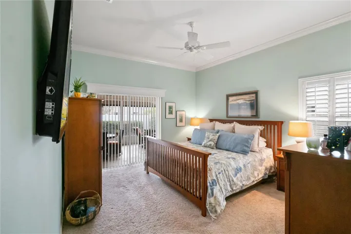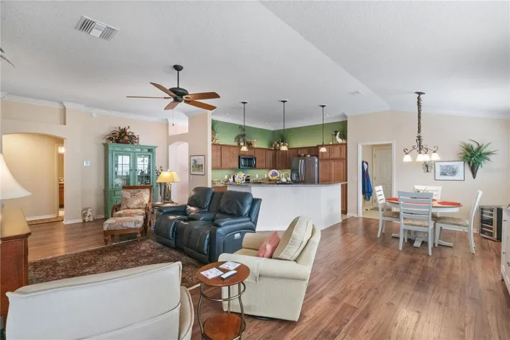 BOND PAID!!! Welcome to this beautifully upgraded Monticello / Cumberland courtyard villa featuring a rare full 2-car garage with a 4-foot extension and outstanding curb appeal with enhanced low-maintenance landscaping. From the moment you arrive you’ll notice the professionally finished epoxy surfaces by B&D Concrete Creations on the front porch, driveway, garage floor and rear lanai, along with Stipes Seamless Gutters installed around the entire villa. An upgraded Anderson storm door with roll-down window and screen adds both style and functionality. Inside, the home is loaded with upgrades including tile flooring with narrow grout lines in the kitchen, foyer and bathrooms, rich wood laminate flooring in the main living areas, and professionally painted interior throughout. Crown molding runs through the entire villa, complemented by beadboard wainscoting under the breakfast bar, custom wood cornices over the sliding glass doors, and plantation shutters on all windows including the garage. Ceiling fans are installed in every room plus two outdoor fans for year-round comfort. The kitchen is a true showstopper with granite countertops in both the kitchen and bathrooms, including a granite composite kitchen sink, pull-out shelving inside cabinets, and custom laundry room cabinetry matching the kitchen cabinetry. The space is accented with upgraded foyer, pendant and dining room lighting, along with above and below cabinet lighting with remote control. The primary suite features a professionally installed TV wall mount with added plug and cable outlet — TV conveys, and the spa-like primary bath was upgraded by Doc’s Restorations featuring a Bella seamless glass shower enclosure. All bedrooms include custom closets. The garage is a dream with built-in cabinetry and workbench, a larger 4-bulb fluorescent light fixture, two additional outlets, attic access with stairs and flooring, and added insulation above the garage. A Cook Aluminum roll-down garage screen was installed 3/2023. Outdoor living shines with the Fortin Construction lanai expansion measuring 13’ x 26’ with roof, complemented by RK Shades electric roll-down shades with remote installed 9/2022 and newly upgraded verticals on the sliding glass doors installed 7/2025 — perfect for relaxing after a day enjoying the community. The big courtyard villa yard provides plenty or room for a pool or large mansard lanai (birdcage). Additional mechanical upgrades include a water softener, Village Plumber dual water filtration system installed 6/2024, epoxy driveway sealer applied 11/2023, and newer appliances including a Whirlpool 4-door refrigerator (6/2022), Whirlpool microwave (10/2023), GE washer and dryer (9/2024), and a new stove (10/2025). This meticulously maintained, extensively upgraded courtyard villa is truly amazing — offering comfort, style, and peace of mind with a paid bond and lower taxes. A must-see home in The Villages! The living room entertainment center, office furniture, and primary bedroom furniture are available separately through the owners.