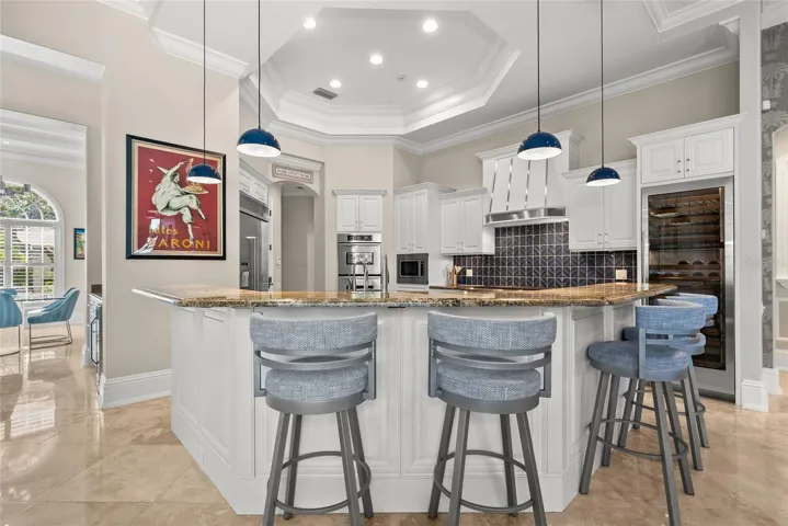 Exceptional indoor-outdoor living is at the heart of the home. Multiple pocketing sliding glass doors open wide to an expansive covered and fully screened lanai, creating a seamless connection between interior and exterior spaces. The outdoor living area is generous in scale and designed for entertaining, featuring a heated pool and spa, summer kitchen, gas fireplace, and multiple areas for dining and relaxation. The large screened layout allows you to comfortably enjoy outdoor living year round, regardless of the weather.