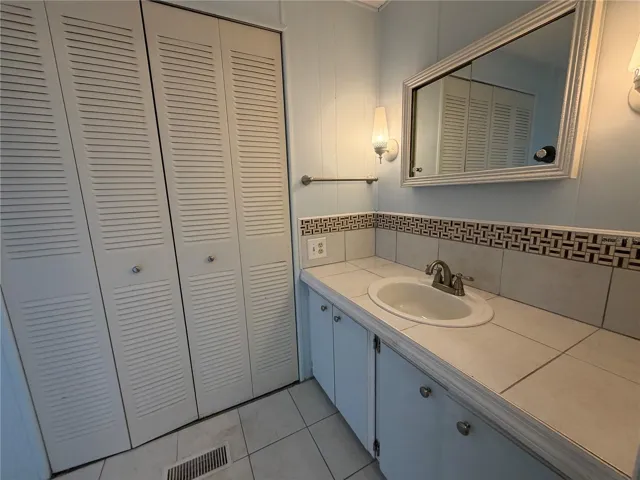 Laminate flooring flows throughout the living spaces, offering durability with a warm, contemporary character. The kitchen is a standout, appointed with tile countertops and a coordinating tile backsplash, paired with sleek stainless-steel appliances (2024) that lend a polished, modern edge. The primary bath features a walk-in shower upgraded with tile walls and floors, highlighted by decorative accent tiles, while the guest bath offers a tub surrounded by upgraded tile walls, creating a clean and functional layout.