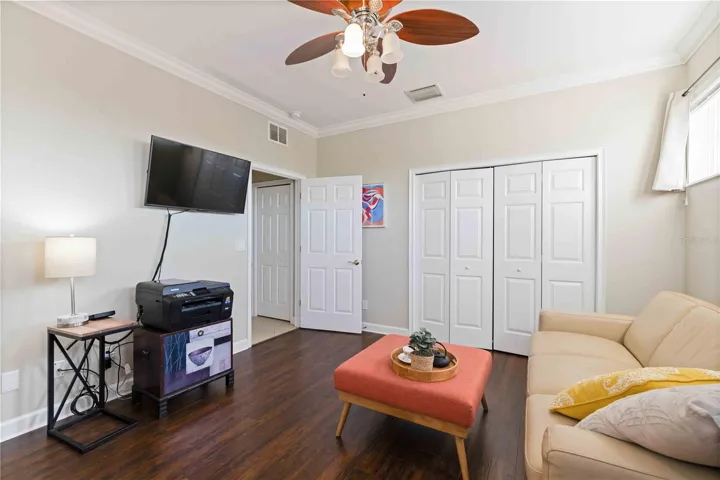 The spacious, open floor plan was designed with intention—guests enjoy their own private space at the front of the home, making them feel relaxed and at ease, while the primary suite at the back becomes a serene owner’s retreat. Ideal for hosting family and friends without ever sacrificing privacy. The primary suite offers a peaceful escape with sliding glass doors to the lanai, electric window shades over sliding doors, a walk-in closet plus an additional built-in closet, and a spa-inspired bath with dual granite vanities, water closet, and a Roman-style walk-in shower with multiple shower heads updated with new tile.