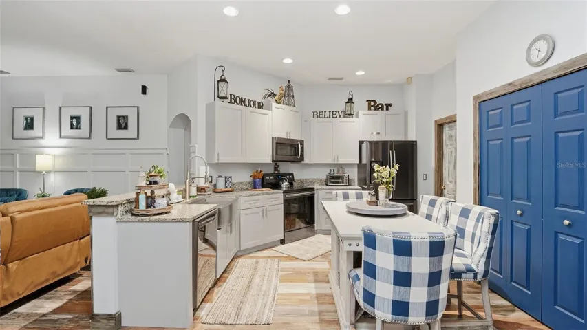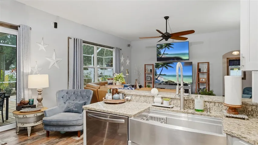 Numerous designer upgrades include seamless luxury vinyl plank flooring throughout (no carpet anywhere), fully remodeled kitchen with beautiful cabinets, spacious island and ample storage, impact-rated hurricane doors and windows (2019), new roof (2023), updated HVAC system (2023), custom molding and trim on windows and doors, pool heater with salt system (2019).