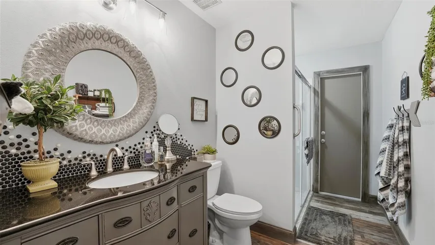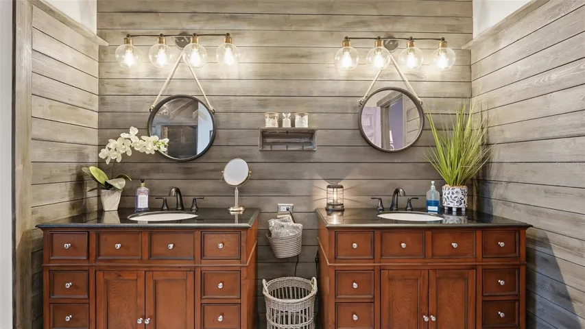 Retreat to the luxurious primary suite, featuring a spa-inspired bathroom with a garden tub, separate shower, modern vanities, and a generous walk-in closet. On the opposite side of the home, two additional bedrooms share a well-appointed second bathroom. The versatile 4th bedroom has its own private bath, which conveniently doubles as a pool bath—ideal for guests and easily enclosed for added privacy.