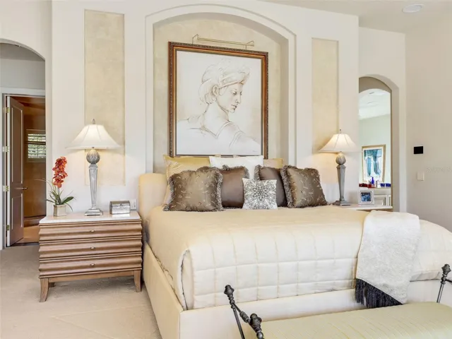 The Master Wing, located on the ground level, offers a private retreat with peaceful water views and outdoor access, dual custom walk-in closets, a workout/bonus room also with outdoor access, private laundry and two spa-inspired bathrooms complete with sinks, vanities, jetted tub, bidet, spa shower heads, and elegant finishes. Guest bedrooms are thoughtfully appointed with ensuite baths, exterior and interior entry, garden and water views, providing comfort and privacy for family and visitors alike.