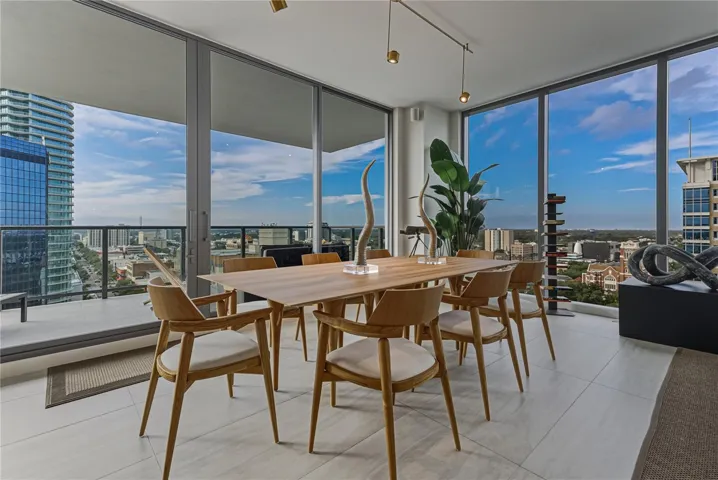 The expansive great room is framed by floor-to-ceiling glass, flooding the space with natural light and creating a seamless connection to the city below. Elevated Uultis furnishings anchor the living and dining areas with understated elegance, while an 85-inch Samsung Frame Pro television with rotating art display and a Sonos surround sound system transform everyday living into a gallery-inspired experience.
