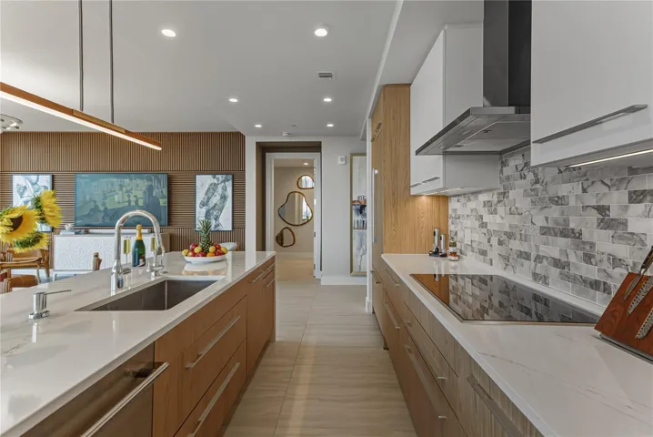 The chef’s kitchen is a study in modern refinement, thoughtfully designed for entertaining, efficiency, and beauty. JennAir appliances, a generous island with plush seating, and premium finishes create a striking yet highly functional centerpiece. The kitchen is fully equipped with high-end cookware, dinner service, utensils, and an extensive collection of barware and glassware for effortless hosting.