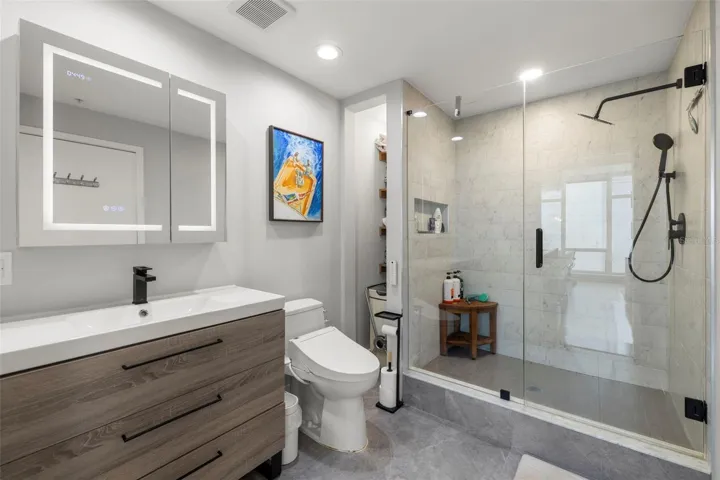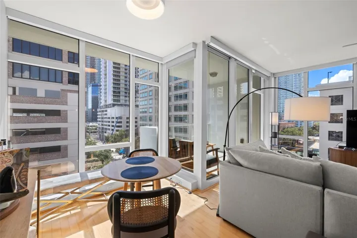 Welcome to the City Lofts Residence at Signature Place Condominiums. A beautifully remodeled and fully furnished 1-bedroom, 1-bathroom corner unit located on the top floor of the liner building that is seamlessly connected to the main tower. This sun-filled residence features high ceilings, expansive windows, and an open-concept layout designed for comfort and modern living. The updated kitchen offers stone countertops, stainless steel appliances, modern cabinetry, and a sleek backsplash. The living area includes window treatments, while the spacious bedroom features an automatic blackout curtain and a custom-built closet for functional storage. The bathroom is finished with a floating vanity, frameless glass shower, and contemporary tile work. Additional highlights include a private air conditioning unit (2021), in-unit washer and dryer, and one assigned garage parking space. Offered fully furnished, including curated furniture, linens, kitchenware, and décor, this home is truly move-in ready. Residents enjoy luxury amenities such as concierge service, heated infinity-edge pool and spa, outdoor grilling stations, multiple lounge areas, and a state-of-the-art fitness center. Ideally located one block from Beach Drive and the St. Pete Pier, with walkable access to the waterfront, dining, shopping, parks, and the vibrant cultural scene of downtown St. Petersburg.