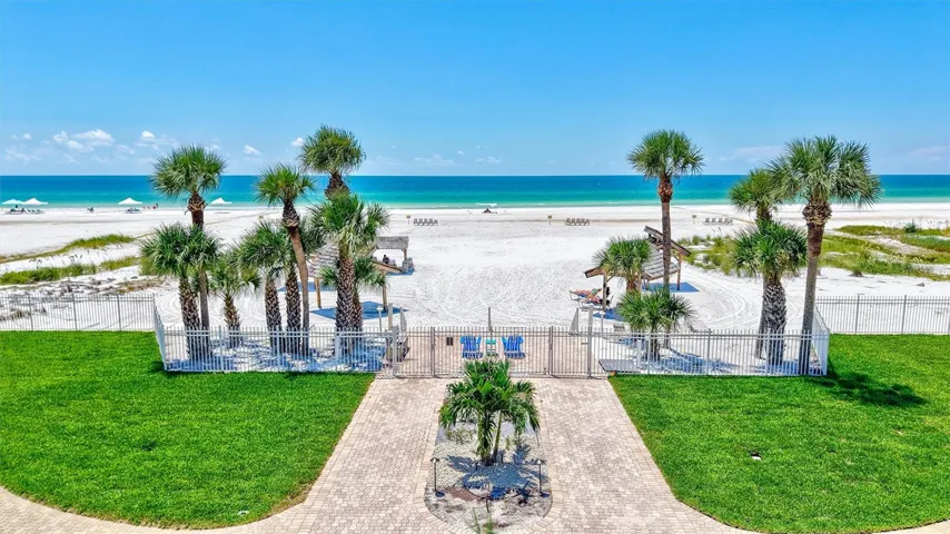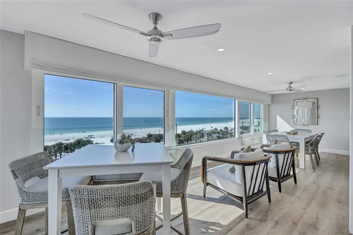 Full west-facing gulf and beach views from this exquisitely designed 3-bedroom condo on Siesta Key’s famed Crescent Beach. This highly desirable end-unit has views from Point of Rocks to the north end of Siesta Key Beach. Never miss a sunset from this turnkey-furnished, move in ready home. No expense was spared in creating this seaside oasis. The original space was reconfigured to add a 3rd bedroom, open the kitchen, and enclose the 30-foot balcony. Slide open the walls of west-facing impact windows bring in the sounds of the beach. The primary bedroom has a wall of accordion glass the folds open to expand the open concept layout. Continuous luxury vinyl flooring throughout the unit creates a seamless transition between spaces. The kitchen has bar seating for 7, an induction stovetop, quartz countertops, and a high-end mosaic backsplash. Across from the kitchen is the dry bar with built-in wine refrigerator and separate ice maker. There is crown molding, dimmable recessed lighting, 5 ½” baseboards, an in-ceiling speaker system throughout the home. The primary bedroom has dual walk-in closets. Updated bathrooms include walk-in showers and stone countertops. This once-in-a-lifetime property is located in Horizons West, a gulf-to-bay community with 300 feet of private beach access and over 7-acres of lush grounds. There are 2 heated pools-one with beach views, a gulf-side spa, beach cabanas and beachside grilling areas. The grounds include an intracoastal waterway park with day dock and a grilling area that is perfect for manatee watching or launching a kayak. Siesta Key’s free island trolley can deliver you to exceptional dining, shopping and entertainment. Welcome home to Siesta Key.