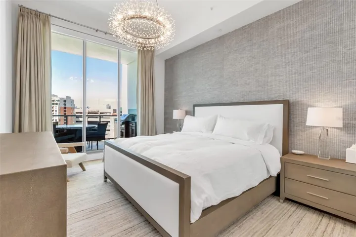 Penthouse level at The Mark Sarasota, featuring complete cosmetic renovation by the owners. Enjoy sweeping west-facing views of Sarasota Bay and downtown Sarasota from this refined residence offering 2,485 square feet under air plus 342 square feet of terrace space, for a total of 2,827 square feet. The thoughtfully designed split-bedroom floor plan includes three en-suite bedrooms, a den/office, three full baths and one-half bath, with a private primary suite wing. Timeless in design, the gourmet kitchen is appointed with Nolte European cabinetry, JennAir stainless steel appliances, upgraded induction range, quartz countertops with a new 6-cm waterfall island and a modern tile backsplash, ideal for entertaining. Open-concept living and dining areas feature soaring 11-foot ceilings, floor-to-ceiling glass and large-format porcelain tile flooring, creating a bright, architecturally refined interior. An expansive west-facing terrace extends the living space outdoors with a built-in grill and beverage refrigerator, ideal for sunset dining. The primary suite is a luxurious retreat with two walk-in closets and a spa-inspired bath offering an oversized double vanity, quartz countertops, walk-in shower and soaking tub. Two guest en suites include generous closets, while the den off the foyer serves as an ideal home office. New Legno European white oak oil-waxed floors enhance all bedrooms. Additional highlights include all-new lighting fixtures throughout, new full-length mirrors in all bedrooms, new bath glass shelving and hardware, a large laundry room with utility sink and new floor-to-ceiling custom cabinetry, a new smart Lutron system controlling lighting and shades, and a new custom wet bar with Sub-Zero beverage drawers and a Scotsman ice maker. Enjoy abundant natural light and glowing Sarasota Bay sunsets overlooking the tropical pool deck. Two deeded parking spaces, with EV charging, plus a climate-controlled storage unit just a short distance from the residence. The fifth-floor amenity level offers a resort-style heated saltwater pool and spa, fire pit, lounge areas, grilling pavilion, bar, club room with catering kitchen, billiards, newsroom, and a premier fitness center with yoga and spin studio. In the heart of downtown Sarasota, enjoy walkable access to top-rated restaurants, Saturday Farmers Market, galleries, salons, cultural venues, Marina Jack and Lido Beach just over the Ringling Bridge. With 24-hour concierge service, secure access, on-site management and pet-friendly living, this residence delivers effortless luxury and coastal sophistication at one of Sarasota’s desired addresses.