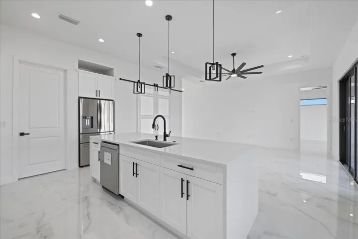 One or more photo(s) has been virtually staged. Experience unparalleled freedom in this newly constructed, no-HOA residence. This 3-bedroom, 2-bathroom home features a bright, and airy, open-concept layout defined by soaring high ceilings. The spacious kitchen equipped with stunning quartz countertops, flows seamlessly into the living room and dining room area, featuring durable, modern ceramic tile. A versatile, dedicated flex room is ideal for a home office or creative space. Finished with designer fixtures, ceiling fans, impact windows/doors, and public water/sewer. Perfectly located just 3 minutes from major roads, groceries, and pharmacies. Schedule your tour today!