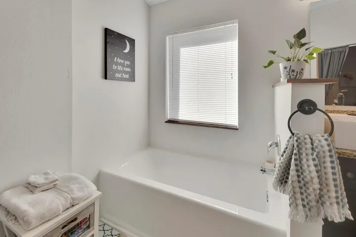 The owner’s suite features vaulted ceilings, a custom walk-in tile shower, a large upgraded soaking tub, walk-in closet, private water closet, and dual modern vessel-style sinks. The second bathroom also includes custom tile shower walls. Solid wood espresso-colored cabinetry is found throughout the kitchen and baths, complemented by recessed lighting in the kitchen and stylish teardrop pendant lights over the breakfast bar. Tile flooring is featured in all wet areas.