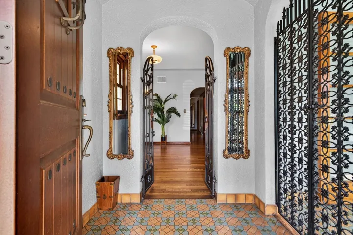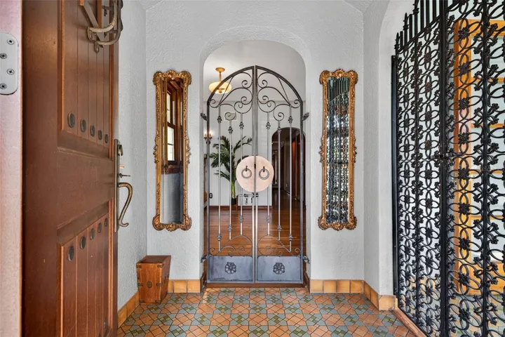 Inside, the home showcases authentic period details including ornate iron gates, original Cuban tile, restored oak hardwood floors, cove plaster ceilings, and exquisite millwork throughout. The spacious living room centers around a stone gas fireplace, while the formal dining room features an original magnolia wood built-in and period lighting. A light-filled sunroom with Cuban tile flooring adds additional flexible living space.