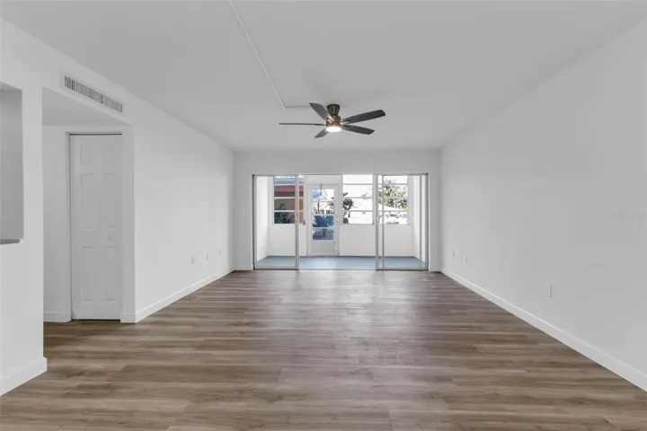The bright, open-concept floor plan seamlessly connects the kitchen, dining, and living areas, creating a welcoming space ideal for entertaining. The completely updated kitchen features new cabinetry, new countertops, a stylish backsplash, and GE stainless steel appliances, including a range, vented microwave, refrigerator, and dishwasher, along with a large sink and garbage disposal. Luxury vinyl plank flooring flows throughout the home, complemented by new doors, updated light fixtures, and ceiling fans, showcasing true pride of ownership.
