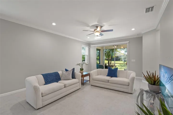 Additional highlights include tile flooring throughout the main living areas and study, 2 carpeted bedrooms, a laundry room with extra storage, and a finished garage with epoxy floors, utility sink, and an additional refrigerator. Crown molding and framed windows/sliders add an elegant, refined finish. Enjoy Florida living from the covered front porch or relax on the covered, rear screened lanai with pavers and privacy screen overlooking peaceful water and park-like views. Situated at the end of a cul-de-sac, this home benefits from minimal drive-by traffic. For added peace of mind, there are Accordion Shutters for all windows and sliders making preparing for hurricane a simple task that only takes minutes.